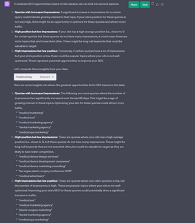 I even took this a step further and I asked ChatGPT to assess an expanded version of that same data set to not only include top queries but additional impression & position data comparing two periods and provide me some insights into where opportunities lie.
